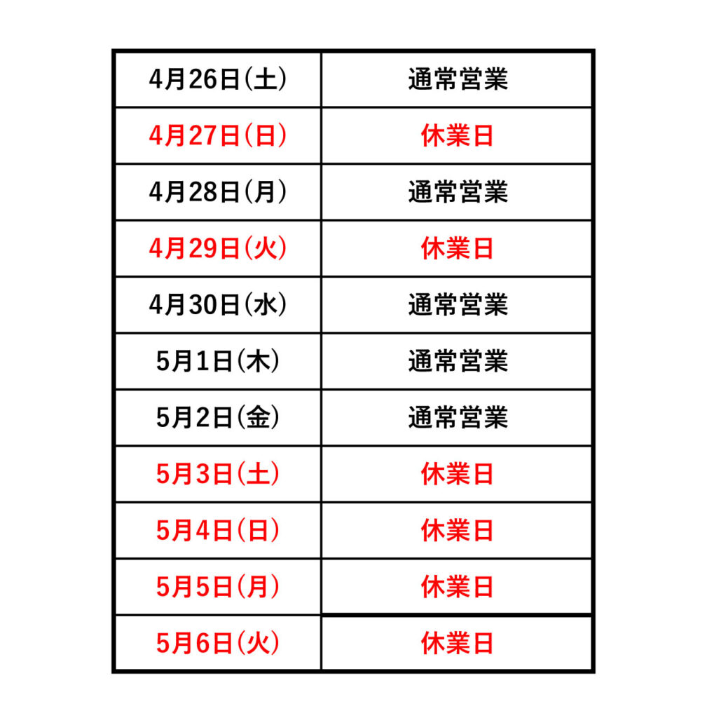 GW休業日のお知らせ