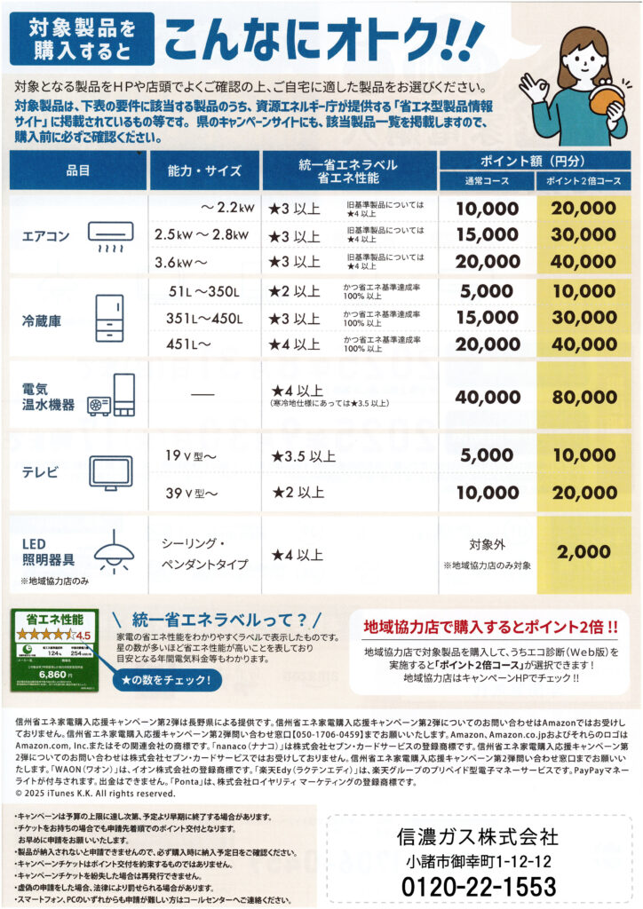 販店の2倍になり、さらにお得になります(^^)/ もちろん、信濃ガスは地域協力店です!