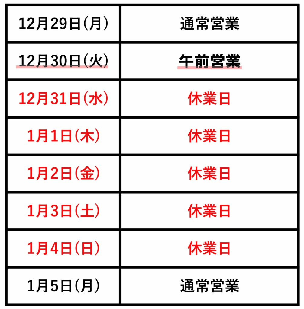 年末年始休業期間:2025年12月31日(水)~2026年1月4日(日)