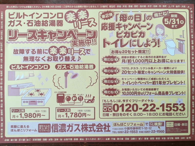 リースキャンペーン! 2018年5月28日 blog キャンペーン情報 by staff-15. いつも、信ちゃんのぽんぽこリフォームをありがとうございます。 今年は1年を通してリースキャンペーンを行います。 コンロや給湯器など、生活に欠かせないんだけど一括で買うには・・・。 月々定価で楽楽に交換できるチャンスです。まずは、メールか電話でお問い合わせください。 合わせて、トイレキャンペーンも同時開催中!!!心地よい季節にこそご検討ください! 小諸市のリフォーム、御代田町のリフォーム、佐久市のリフォーム、軽井沢町のリフォーム、東御市のリフォームなら信ちゃんのぽんぽこリフォームへ!!! 前の記事 次の記事